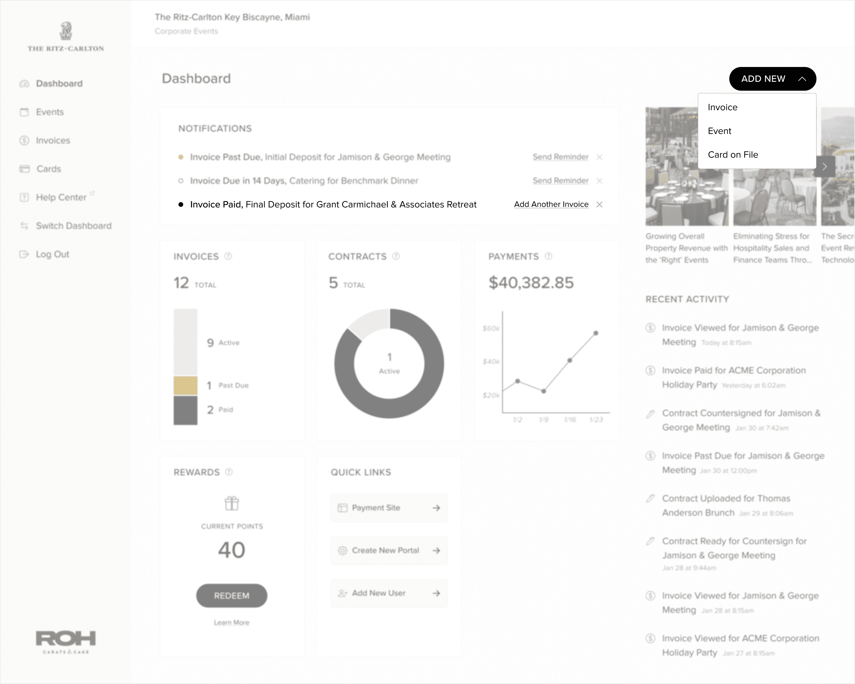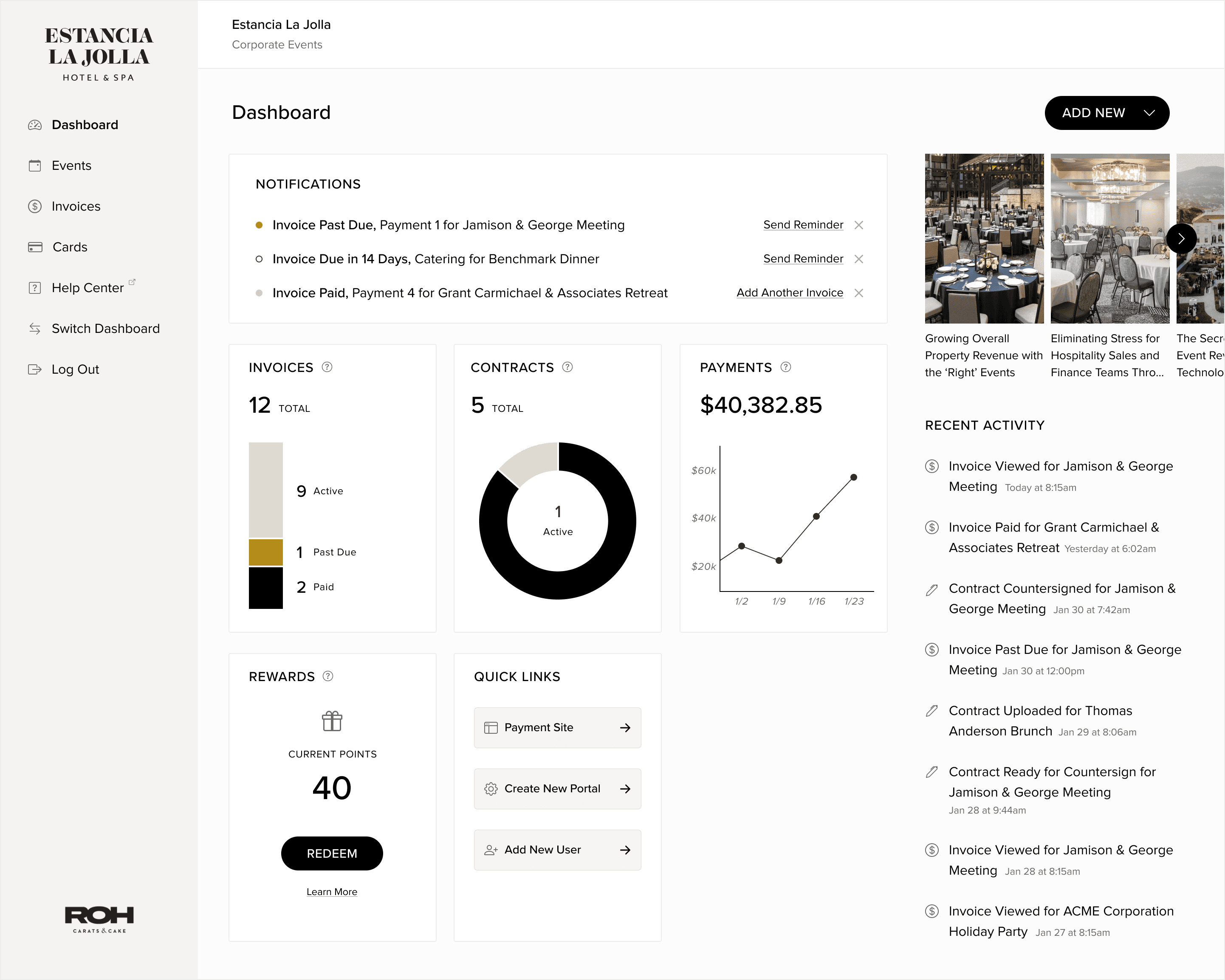 Notifications, quick insights and a recent activity feed all directly address the need for a venue admin to have quick, up-to-date insight into invoices & payments