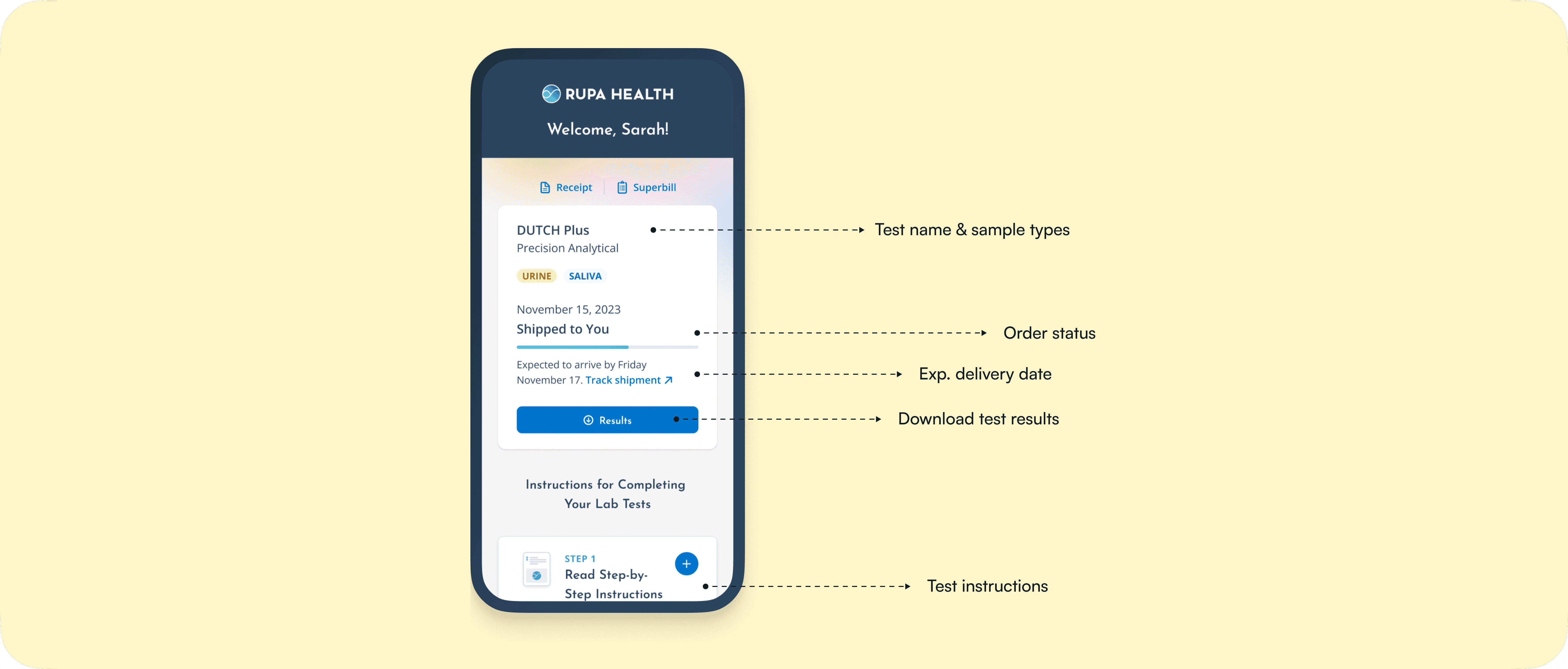Rupa’s patient portal was initially designed to provide clear status updates and instructions for patients after their practitioners ordered lab tests via Rupa.