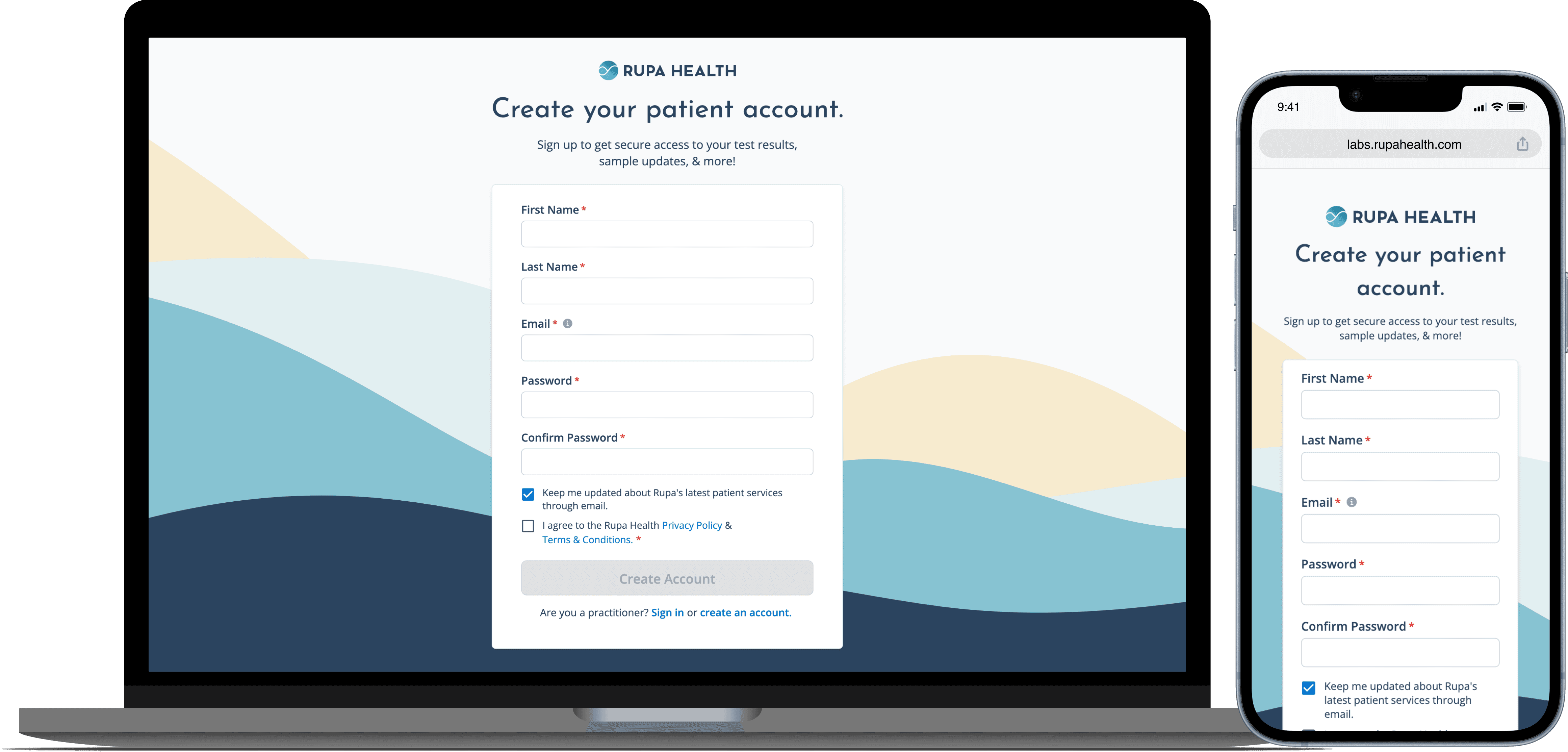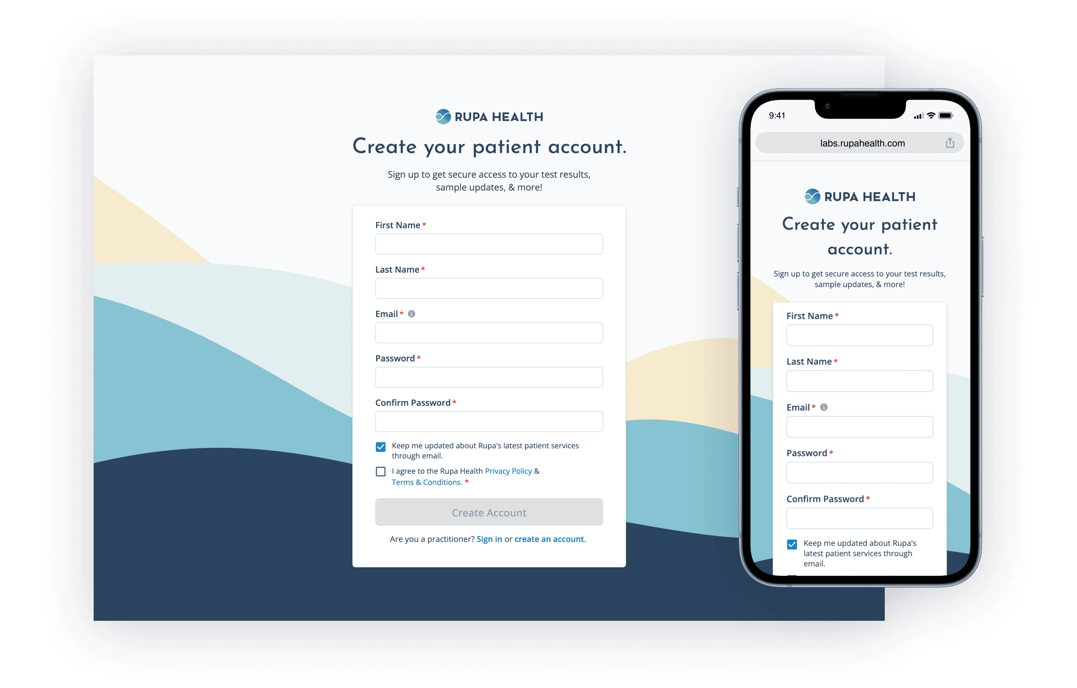 Mobile-first design was vital for this project since the majority of patients accessed their portals on their mobile devices. I worked alongside the Head of Design to ensure the flow from account creation to viewing ordered lab tests in the portal was seamless and followed Rupa’s brand voice and visual direction.